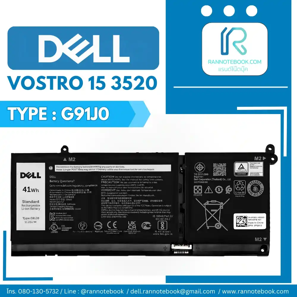 แบตเตอรี่แท้ Dell Vostro 15 3520 (G91J0) ช่วยแก้ปัญหาแบตเสื่อมหรือเก็บไฟไม่อยู่ ให้โน้ตบุ๊กกลับมาใช้งานได้ยาวนานอีกครั้ง มีระบบป้องกันความปลอดภัยครบถ้วน ประกัน Dell Thailand 1 ปีเต็ม